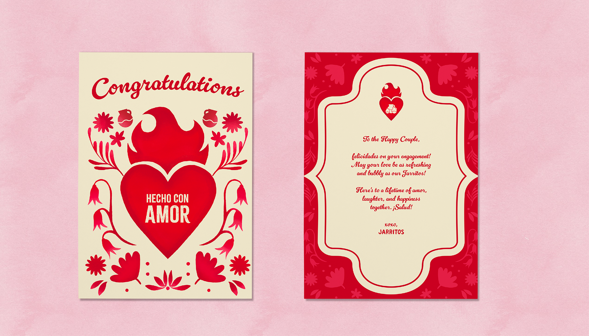 This greeting card was designed to celebrate the engagements of Jarritos fans. I illustrated the design using one of Jarritos' popular slogans, "Hecho con amor." The card was sent to any Jarritos fan who shared their wedding invitation with us.